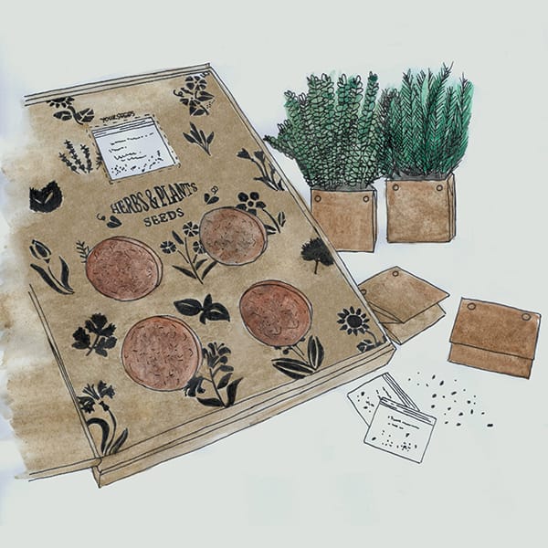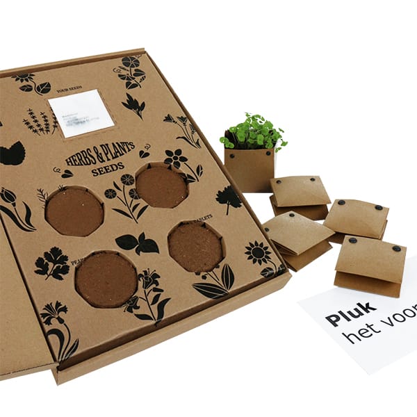 Letterbox plant set A4 with herbs for the kitchen. Plant set with herbs or flowers. Supplied with 4 collapsible pots, 4 peat tablets and 4 seed packets. Packed in an attractive letterbox box. This product is very light so that the shipping costs can be kept low. Simply supply a mailing list and we’ll take care of the rest! We can personalize this letterbox gift by simply adding a full-colour card that we design together. We can also provide the box with an imprint or a bandarol from 500 pieces. This gift is also available in an A5 version.